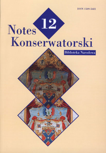 Notes Konserwatorski (nr 12)Kolejny numer rocznika podsumowuje realizację Wieloletniego Programu Rządowego na lata 2000-2008: "Kwaśny papier. Ratowanie w skali masowej zagrożonych polskich zasobów bibliotecznych i archiwalnych". W dwóch artykułach zaprezentowano tematykę badawczą dotyczącą stanu zachowania kórnickich oraz toruńskich zbiorów archiwalnych i bibliotecznych. Na uwagę zasługują niezmiernie ciekawe prace z cyklu o restauracji zbiorów specjalnych - konserwacja dokumentów pergaminowych z XIV-XIX w. z archiwum rodziny Saint-Genois d`Anneaucourt z Jaworza i papierowych obić ściennych z Pałacu w Wilanowie i Zamku w Burgschlitz. W Notesie znalazła się również ocena skuteczności konserwacji obiektów rękopiśmiennych dotkniętych korozją atramentową przy użyciu DTPA.