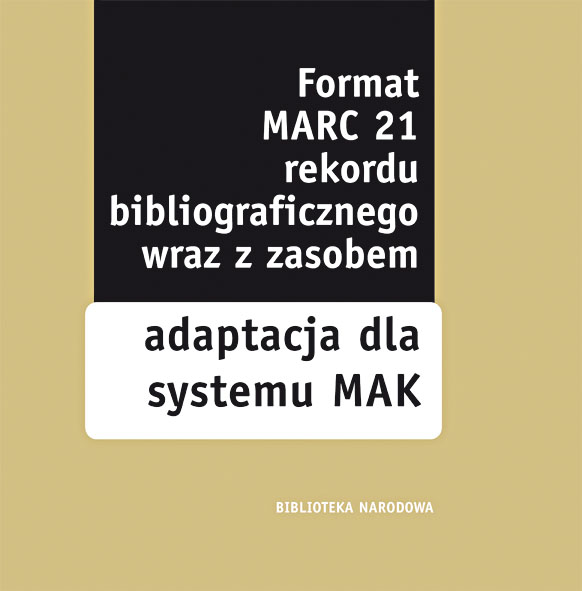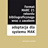 Format MARC 21 rekordu bibliograficznego wraz z zasobem, adaptacja dla systemu MAKPublikacja została przygotowana z myślą o opracowaniu następujących typów dokumentów: piśmienniczych (książek, starych druków, rękopisów), wydawnictw ciągłych, elektronicznych, wizualnych (ikonograficznych, filmów), dźwiękowych, muzycznych, kartograficznych, artykułów (recenzji). Na tej podstawie ujednoliceniu uległa również rozpowszechniana przez Bibliotekę Narodową baza MAK (tzw. baza wzorcowa). Wszelkie zmiany będą na bieżąco uzupełniane w instrukcji i w samej bazie, o czym użytkownicy systemu MAK będą informowani na stronach witryny BN.