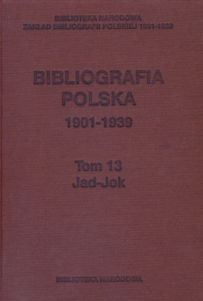 Kolejny, trzynasty tom Bibliografii polskiej 1901-1939 obejmuje hasła na litery Jad-Jok i zawiera ponad 6,4 tysiąca pozycji. Bibliografia opracowywana jest przez Zakład Bibliografii Polskiej 1901-1939 w systemie MAK z zastosowaniem formatu MARC 21. Publikacja stanowi nieocenione źródło informacji o wszystkich działach piśmiennictwa rozwijających się w Polsce w latach 1901-1939 (także o publikacjach obcych uznanych za polonica zagraniczne).