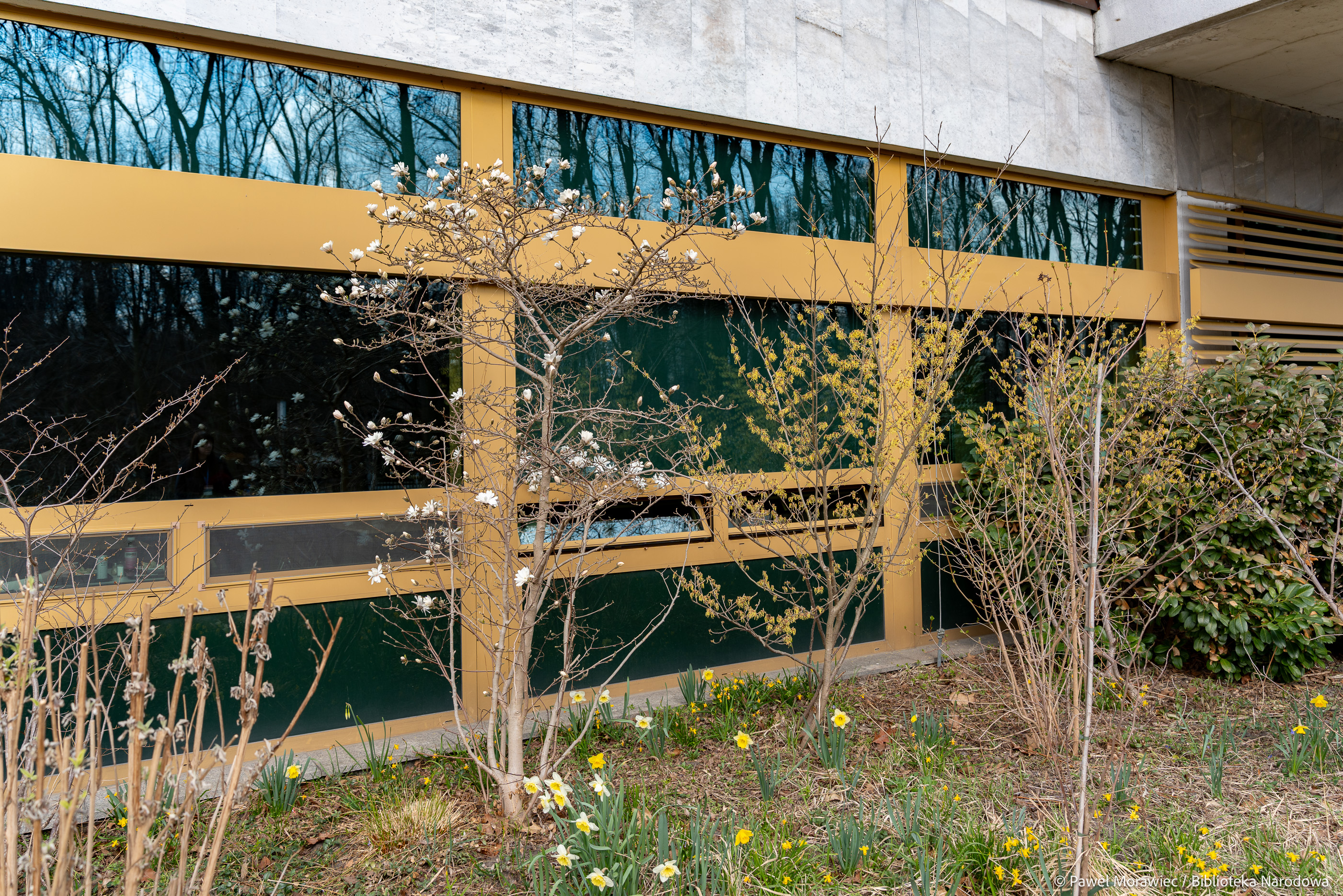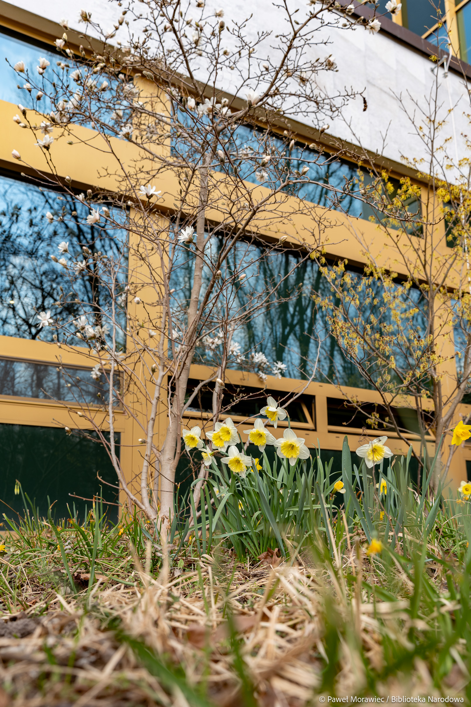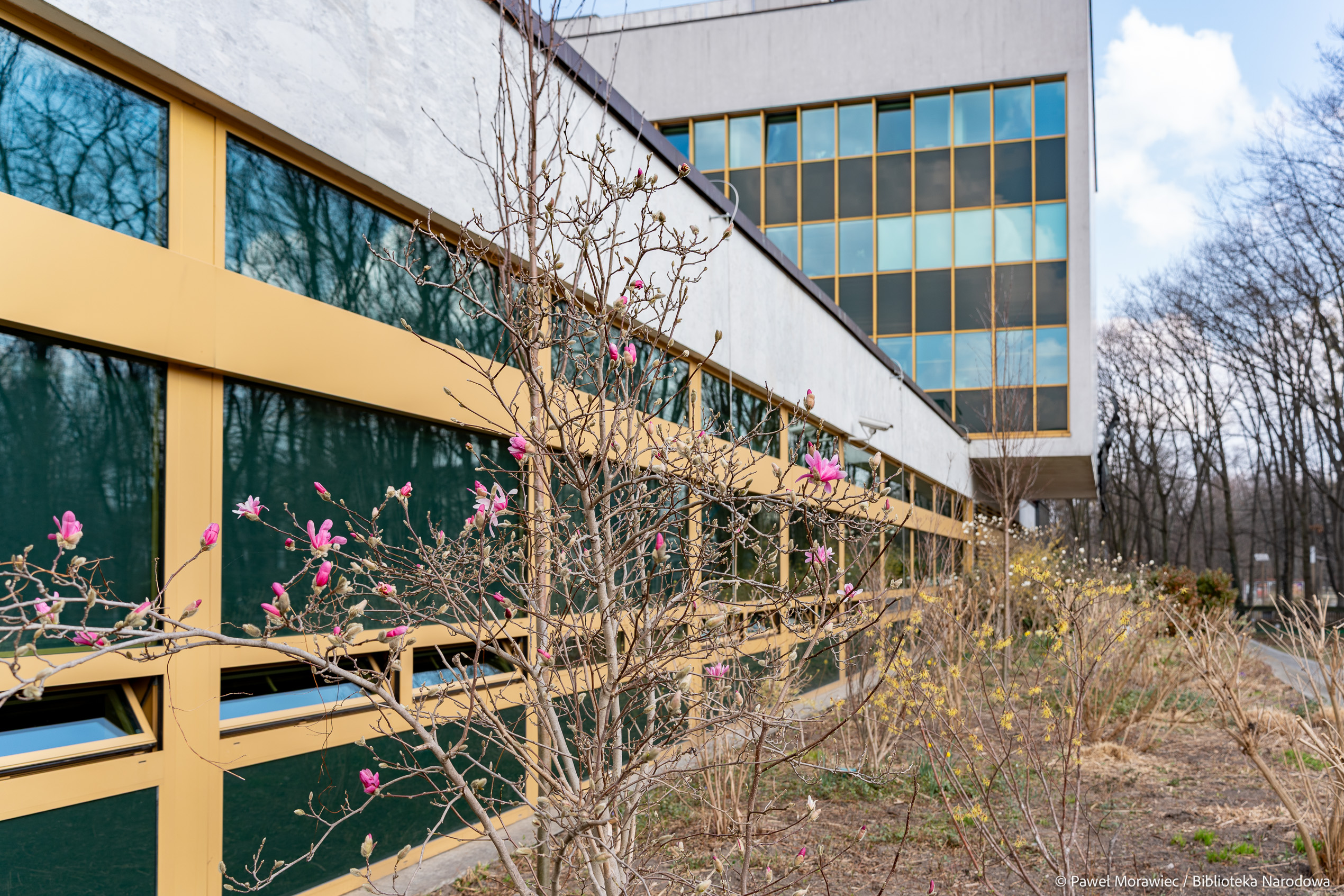 Kalendarzowa wiosna zawitała już do Biblioteki Narodowej. Wokół budynku przy al. Niepodległości 213 pojawiają się delikatne, ale pełne życia akcenty natury: kwitnąca magnolia, żonkile, krokusy oraz rozchodnik karpacki. Te pierwsze oznaki budzącej się przyrody ożywiają otoczenie po zimowych miesiącach i dopełniają wiosenny obraz zieleni wokół Biblioteki Narodowej. Na patio przy Czytelni Dolnej można oglądać kwiaty ciemierników w odcieniach bieli i różu.
