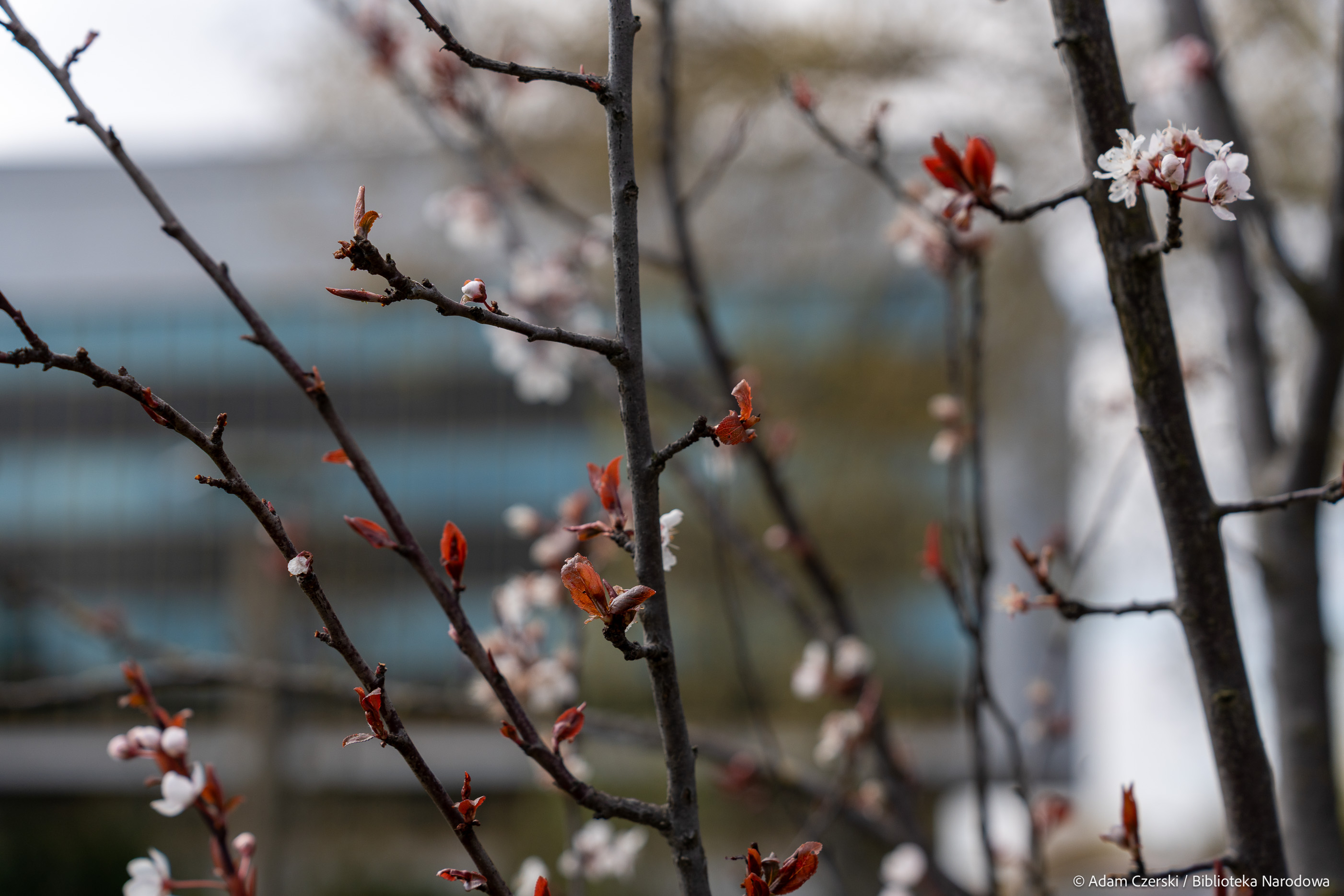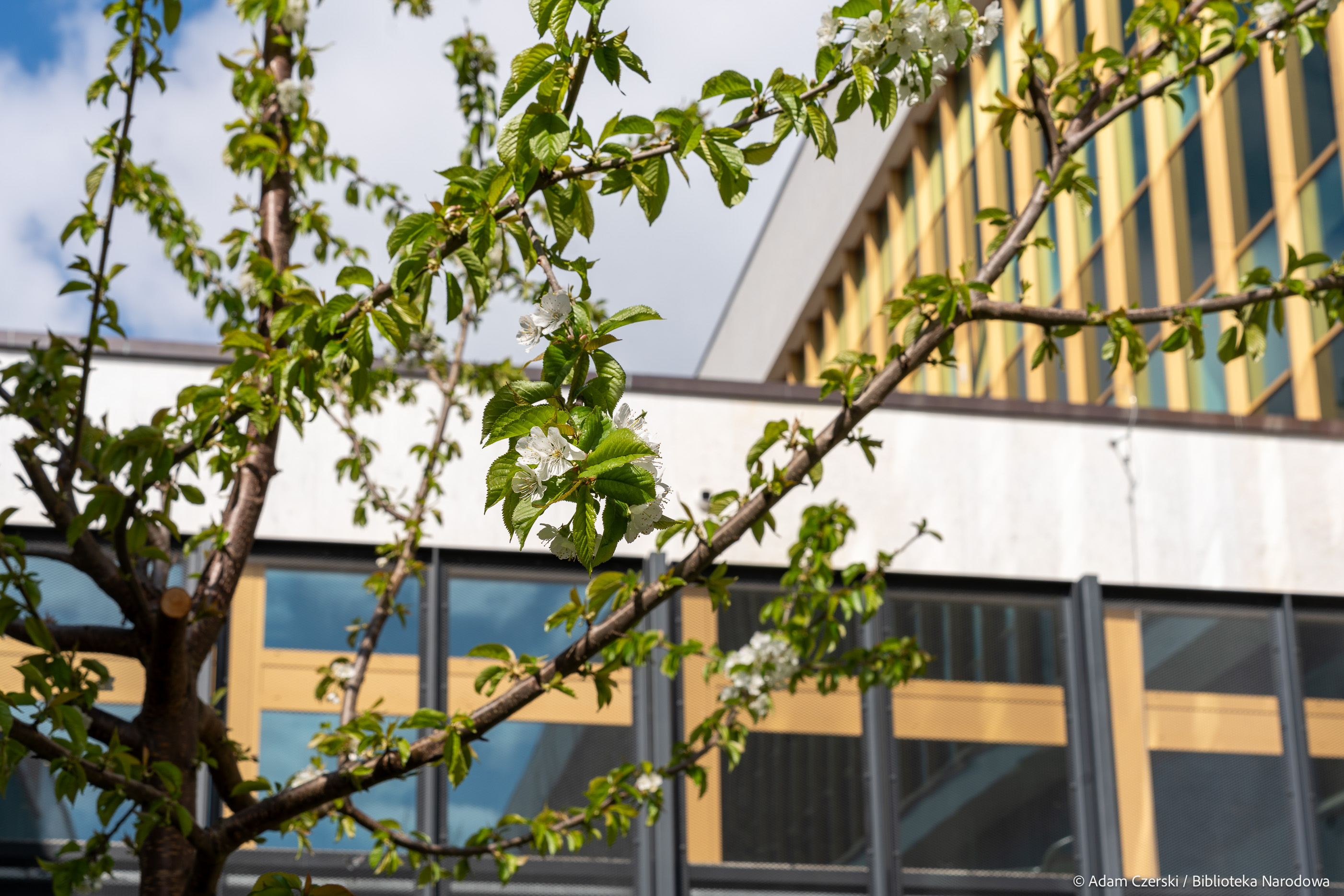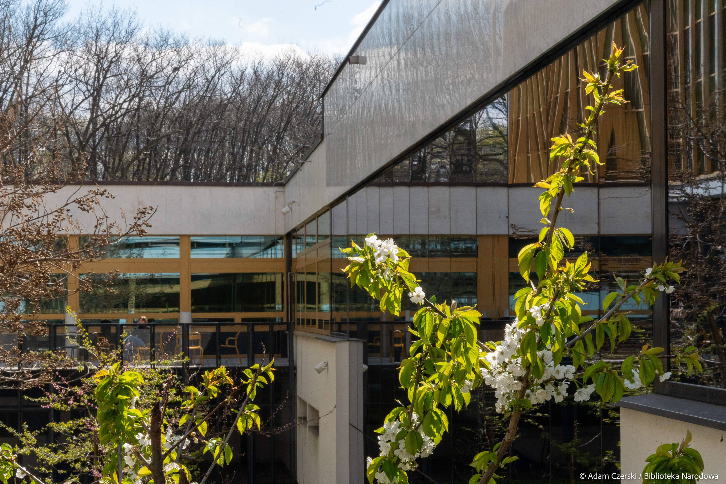 Wiosna coraz mocniej urozmaica krajobraz wokół Biblioteki Narodowej. Na patio przy Czytelni Dolnej można podziwiać kwitnące czereśnie i brzoskwinie. Drzewa obsypane białymi i różowymi kwiatami są doskonale widoczne z tarasów przy kawiarni oraz przy Czytelni Encyklopedii i Słowników, które są już otwarte. Z kolei przy wjeździe na parking pojawiły się niebieskie szafirki, a od strony Alei Niepodległości zakwitły cebulice syberyjskie.