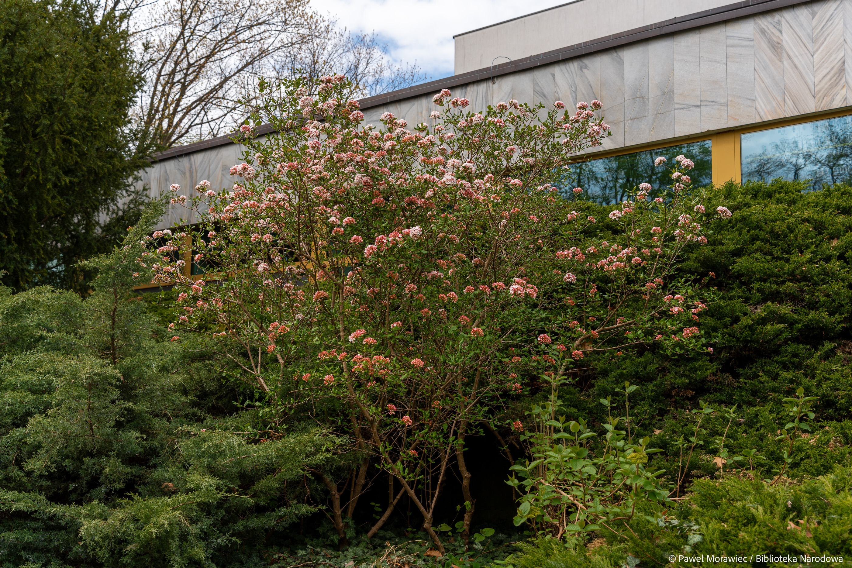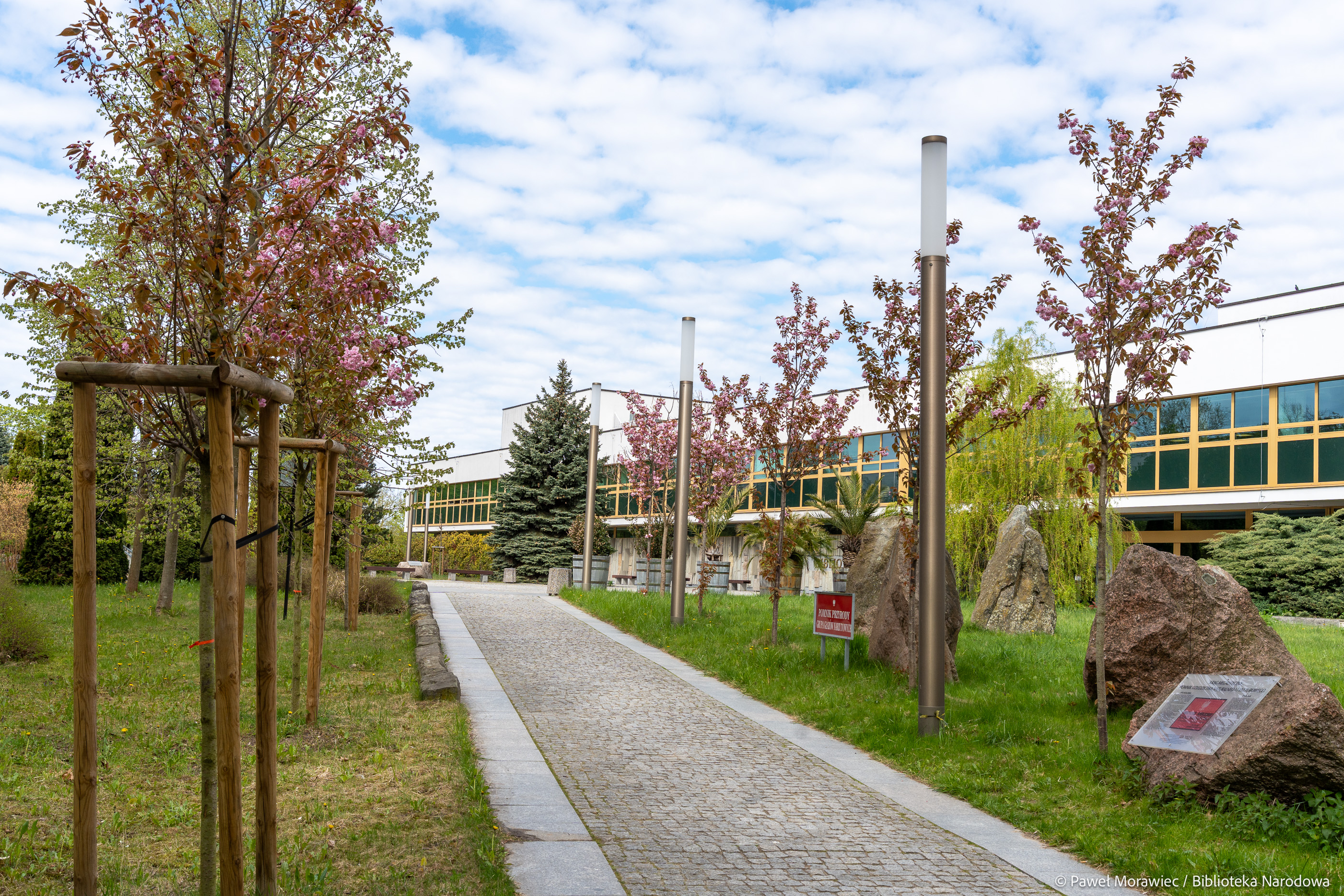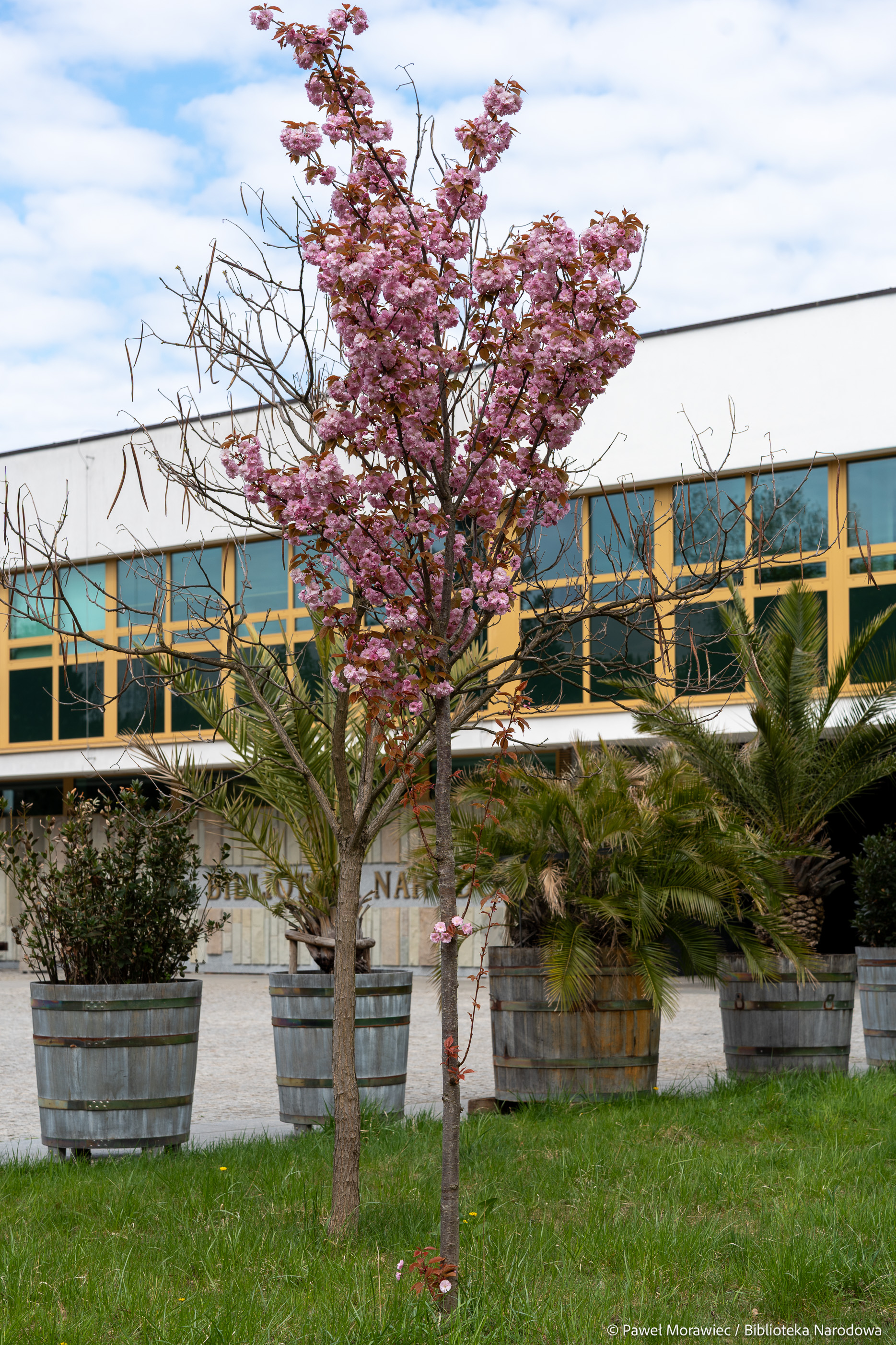 Wiosna w pełni rozgościła się wokół siedziby głównej Biblioteki Narodowej przy Alei Niepodległości 213. W ogrodzie zakwitły kolejne rośliny: wiśnie piłkowane oraz kaliny koreańskie.