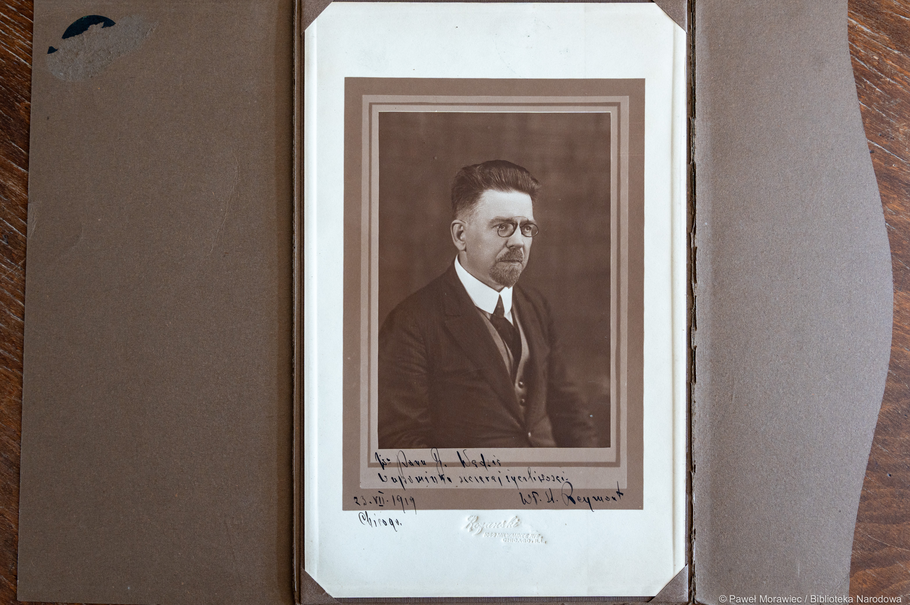 Fotograficzny portret Władysława St. Reymonta, wykonany w lipcu 1919 roku w chicagowskim atelier Zygmunta Różańskiego, stanowi ilustrację wspomnianego rękopisu oraz amerykańskiej misji noblisty. Jak zapisał Reymont w dedykacji, jest on Napominką szczerej życzliwości.