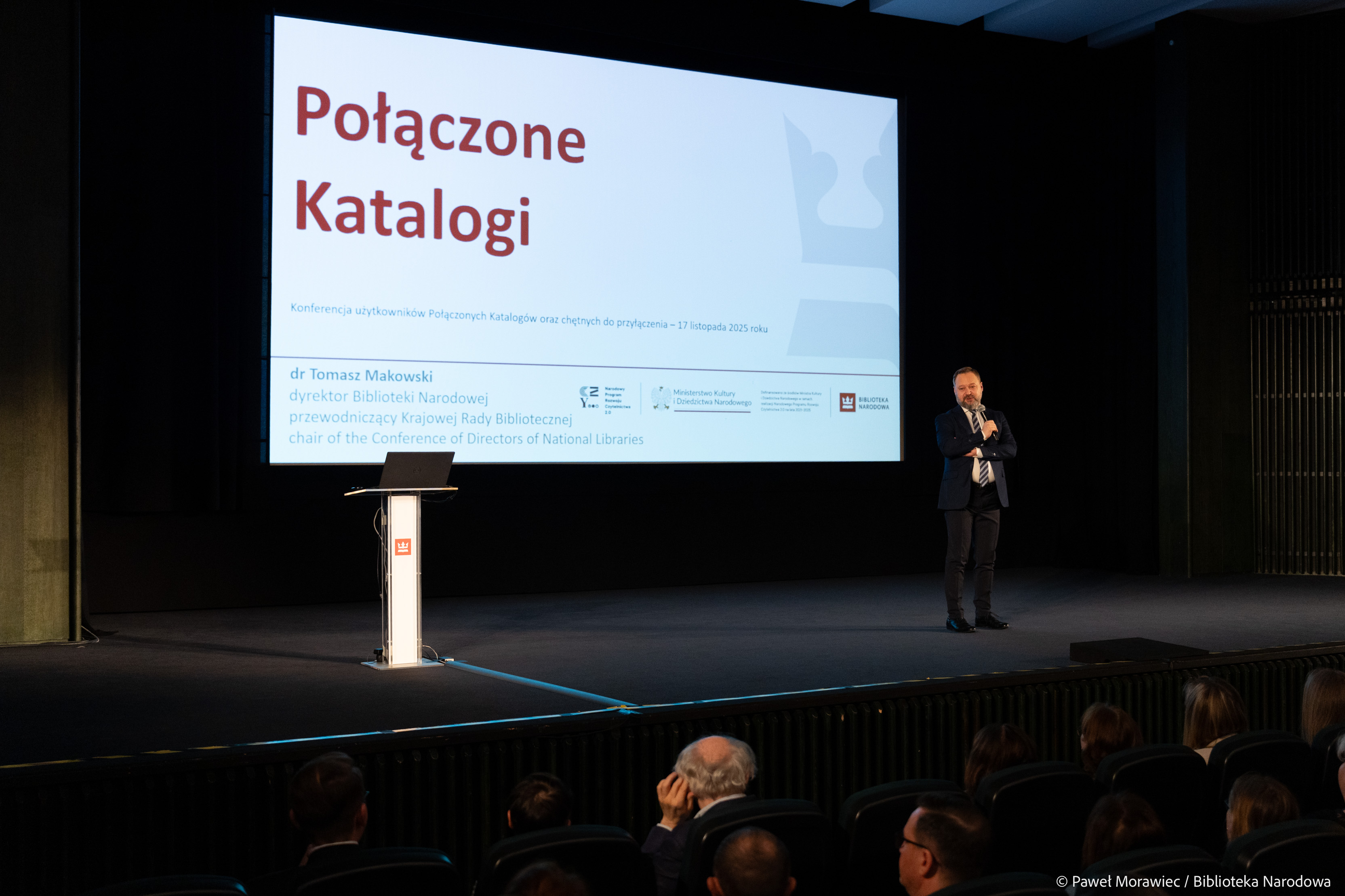 Pierwszy dzień obrad skupił się na wystąpieniach plenarnych. W sesji otwierającej dr Tomasz Makowski, dyrektor Biblioteki Narodowej, przedstawił rolę i znaczenie Połączonych Katalogów, wskazując na rosnące zainteresowanie bibliotek oraz dynamiczny rozwój infrastruktury opartej na zintegrowanym systemie zarządzania zasobami bibliotek. Podsumował także pięcioletnie efekty realizacji „Narodowego Programu Rozwoju Czytelnictwa 2.0. na lata 2021-2025”, Priorytetu 1. Poprawa oferty bibliotek publicznych, Kierunku Interwencji 1.2. Budowa ogólnokrajowej sieci bibliotecznej poprzez zintegrowany system zarządzania zasobami bibliotek, w ramach którego do Połączonych Katalogów przyłączono 142 biblioteki.