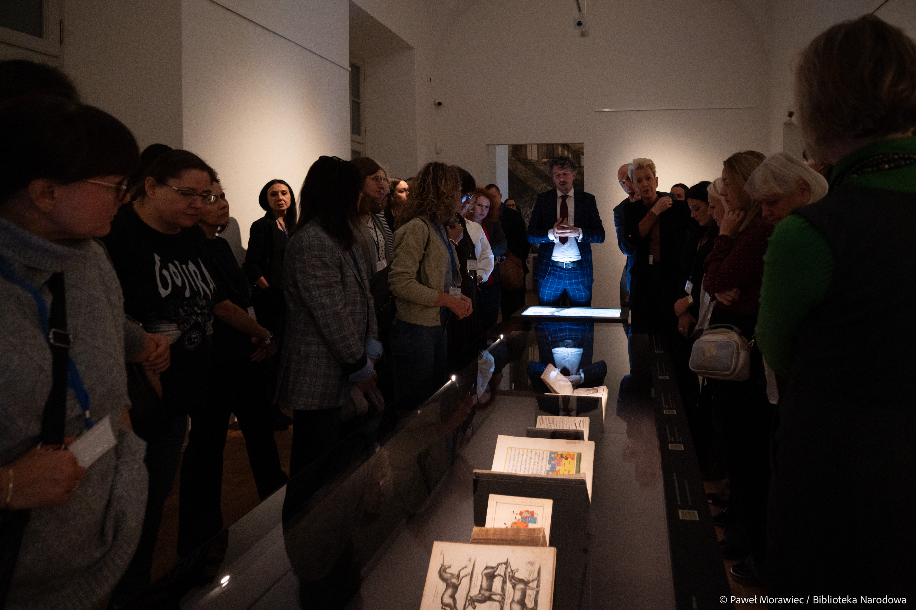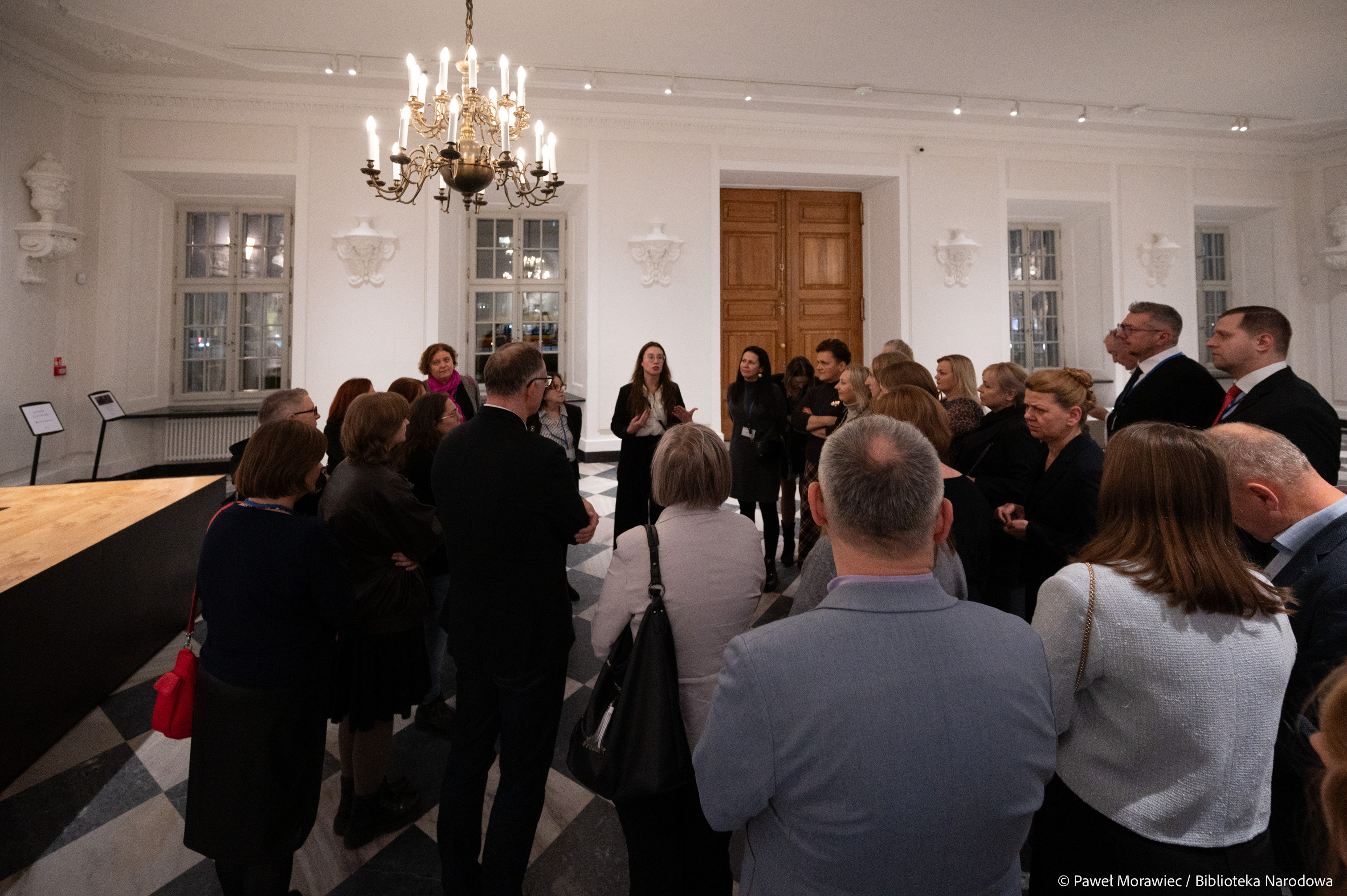 Wieczorem uczestnicy mieli okazję zwiedzić Skarbiec Biblioteki Narodowej w Pałacu Rzeczypospolitej oraz wziąć udział w kuratorskim oprowadzaniu po wystawie czasowej Jam posełkini jego. Język i emocje polskiego średniowiecza. Dzień zakończyło spotkanie sieciujące, tworzące przestrzeń do nieformalnych rozmów, wymiany doświadczeń i budowania relacji między bibliotekami.