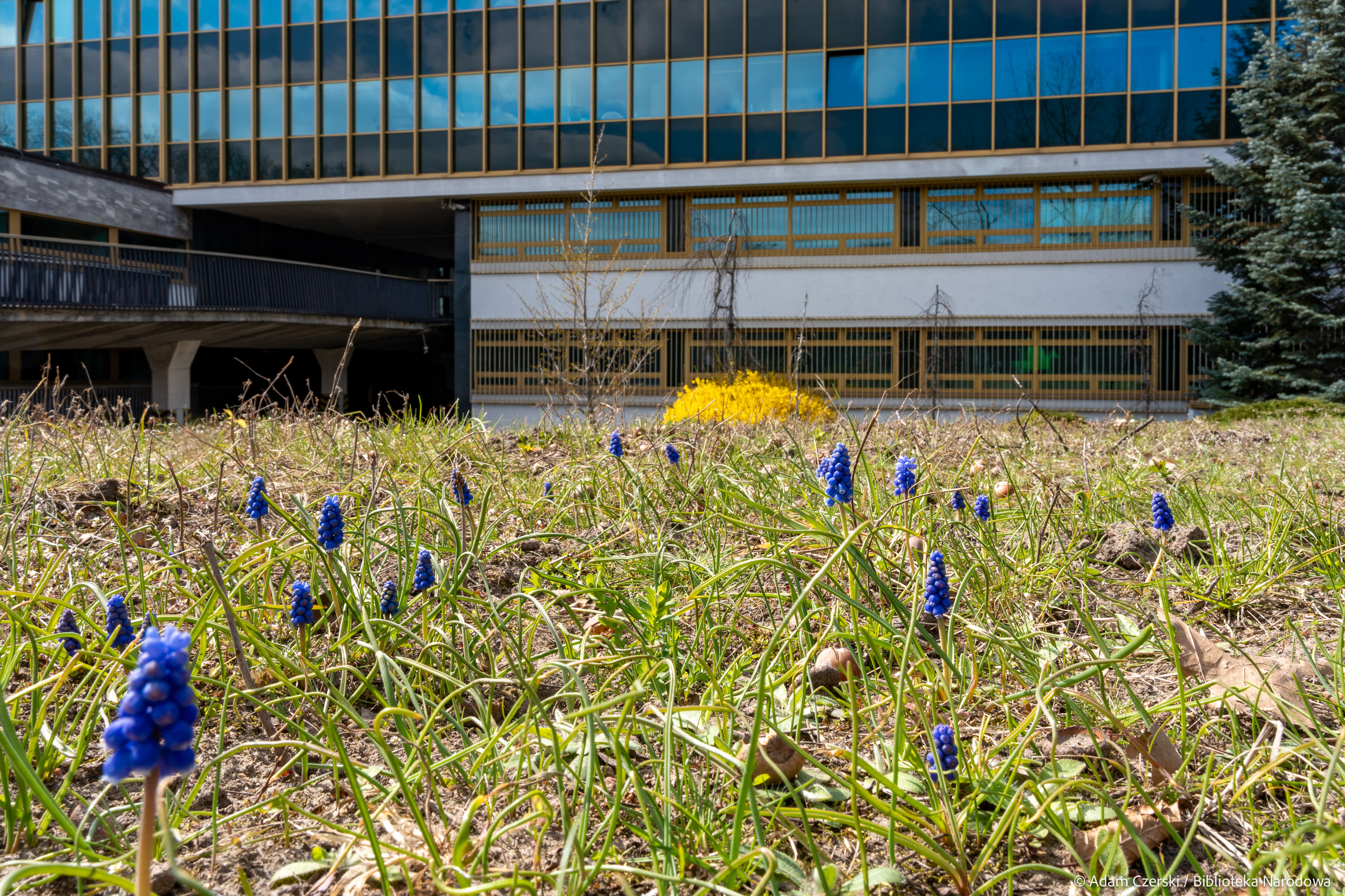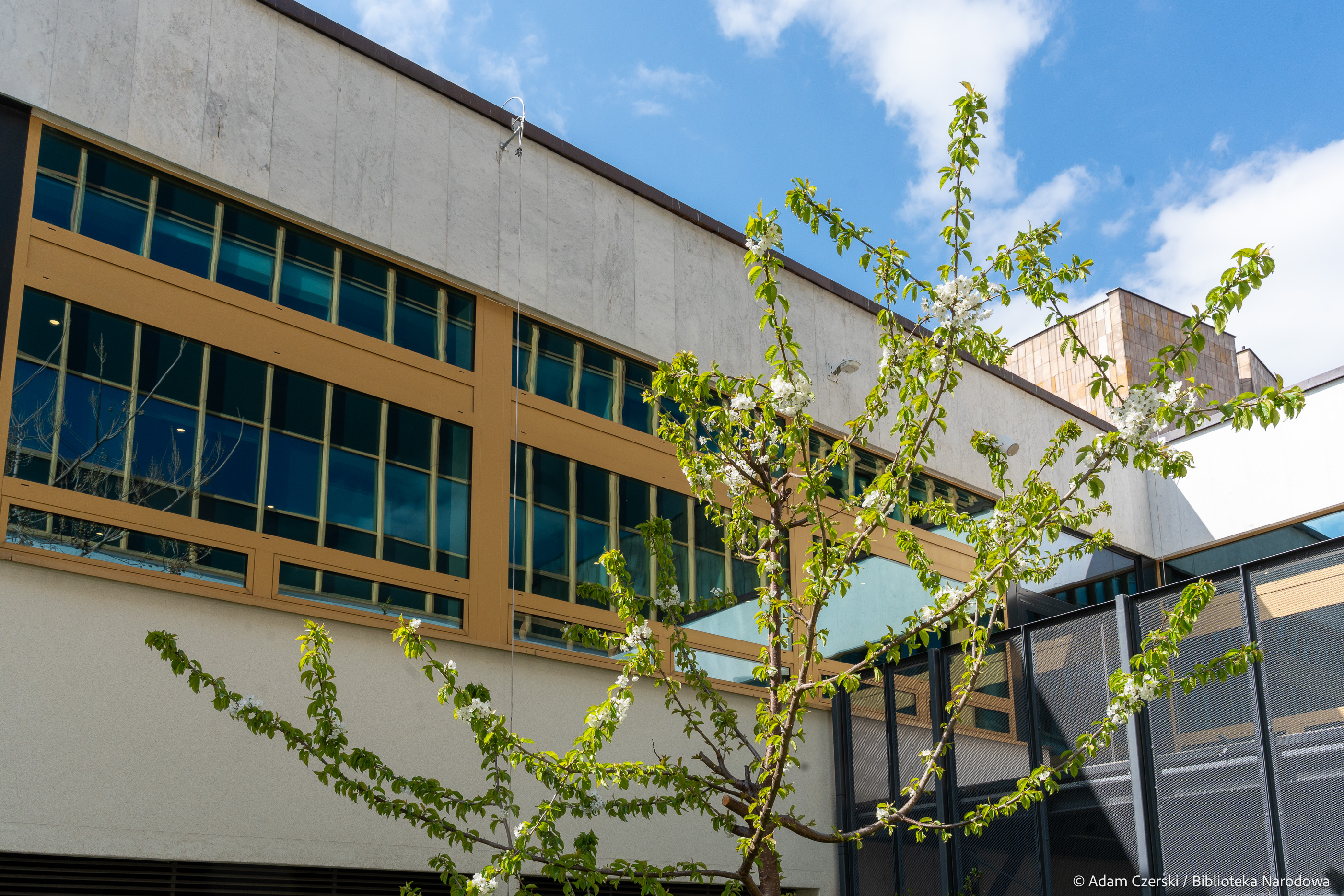 Wiosna coraz mocniej urozmaica krajobraz wokół Biblioteki Narodowej. Na patio przy Czytelni Dolnej można podziwiać kwitnące czereśnie i brzoskwinie. Drzewa obsypane białymi i różowymi kwiatami są doskonale widoczne z tarasów przy kawiarni oraz przy Czytelni Encyklopedii i Słowników, które są już otwarte. Z kolei przy wjeździe na parking pojawiły się niebieskie szafirki, a od strony Alei Niepodległości zakwitły cebulice syberyjskie.