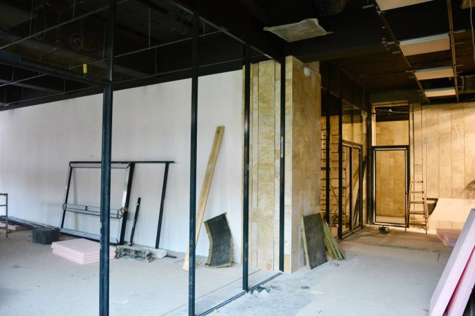 Nowe ściany, wybudowane w ramach zmiany aranżacji pomieszczeń przeznaczonych na księgarnię i kawiarnię, okładane są oryginalnym kamieniem odzyskanym z demontowanych fragmentów starych ścian.