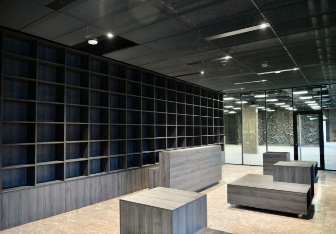 Mimo utrudnień związanych z pandemią, prace w obszarze księgarni zakończyły się w terminie umownym. Wykonawca zamontował stolarkę wejściową oraz przeszkloną ścianę z przejściem do obszaru czytelń. Zakończono montaż wszystkich instalacji i paneli wykończeniowych na suficie. Dostarczono i zamontowano umeblowanie.