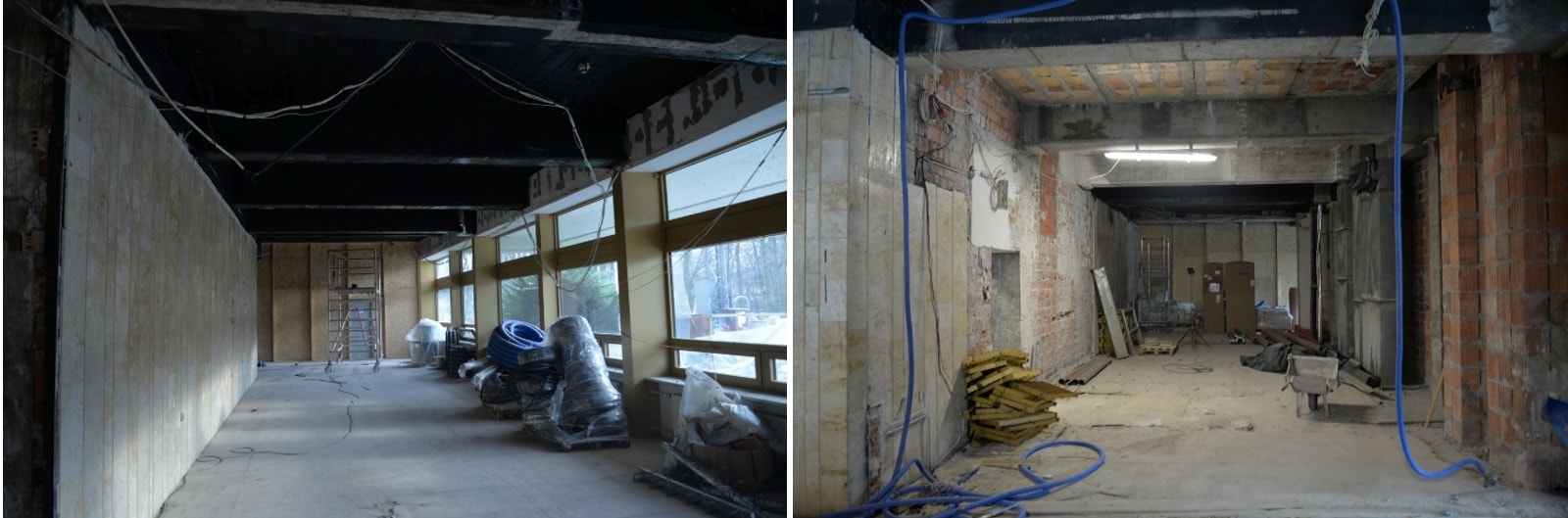 Miejsce na nową księgarnię, która znajdzie się po prawej stronie za głównym wejściem do budynku zostało już oczyszczone i przygotowane. Od strony wejścia księgarnia oddzielona będzie ścianka działową ze szklanymi drzwiami, natomiast przejście w stronę czytelń i kawiarni będzie w całości przeszklone. Wyburzono zbędne ściany działowe w korytarzu darczyńców, który będzie pełnił funkcje bezpośredniego przejścia do kawiarni i czytelń.