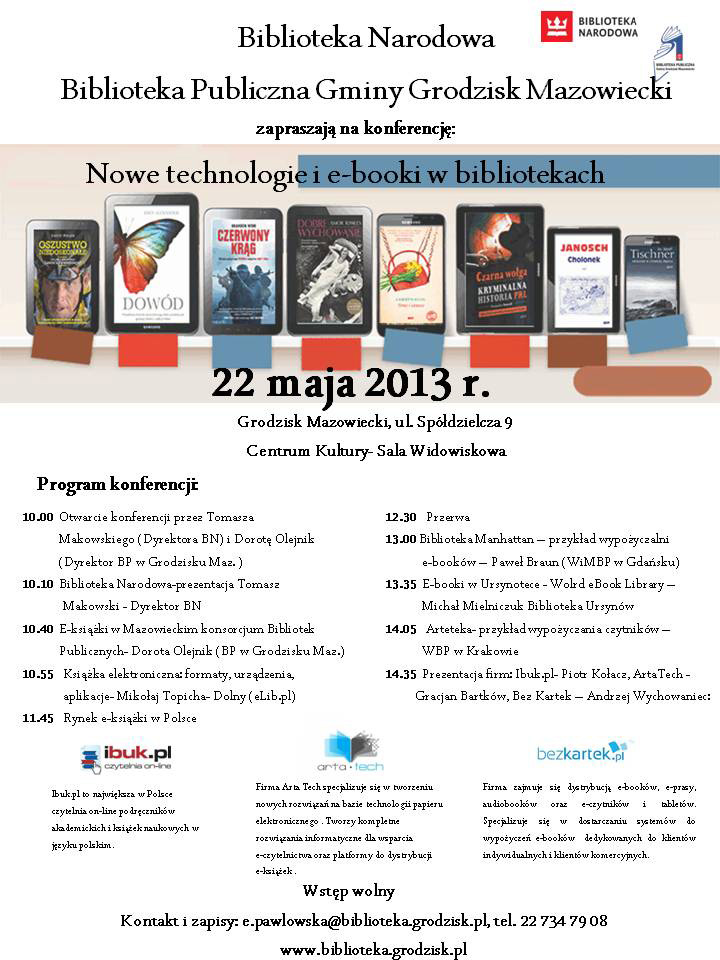 Biblioteka Narodowa i Biblioteka Publiczna Gminy Grodzisk Mazowiecki serdecznie zapraszają na konferencję "Nowe technologie i e-booki w bibliotekach", która odbędzie się 22 maja w Grodzisku Mazowieckim.